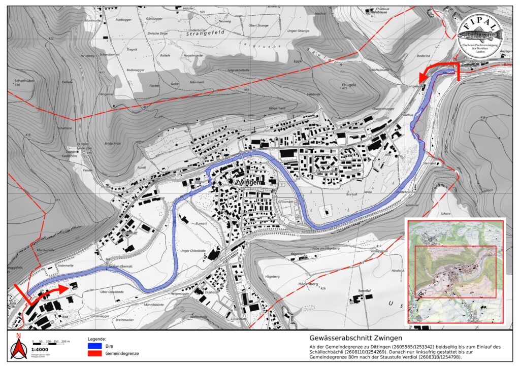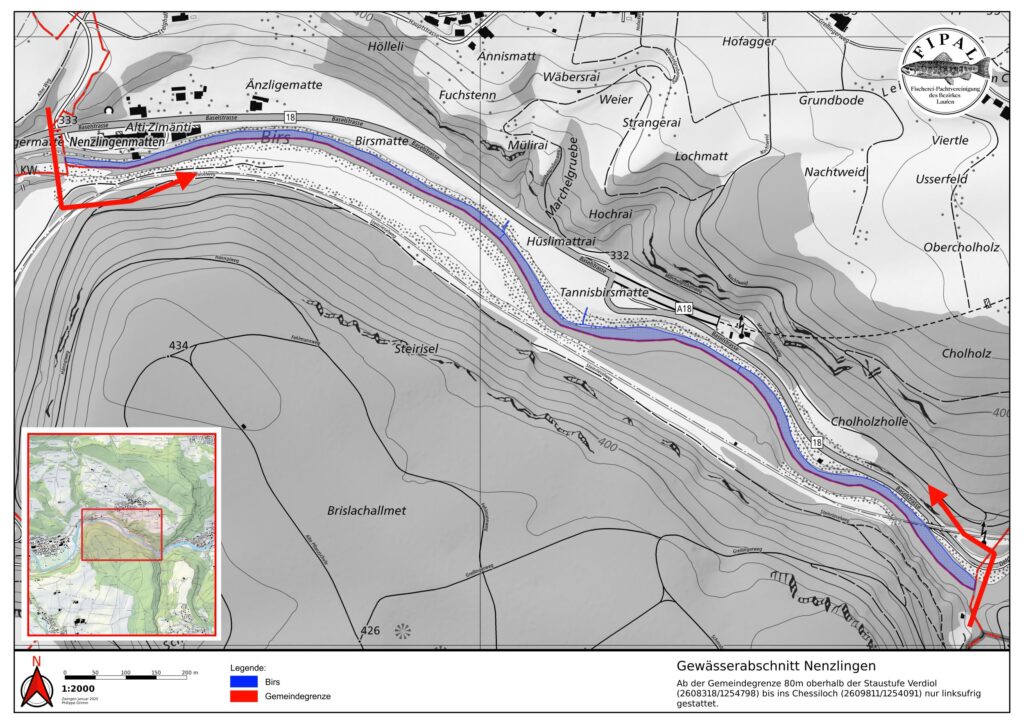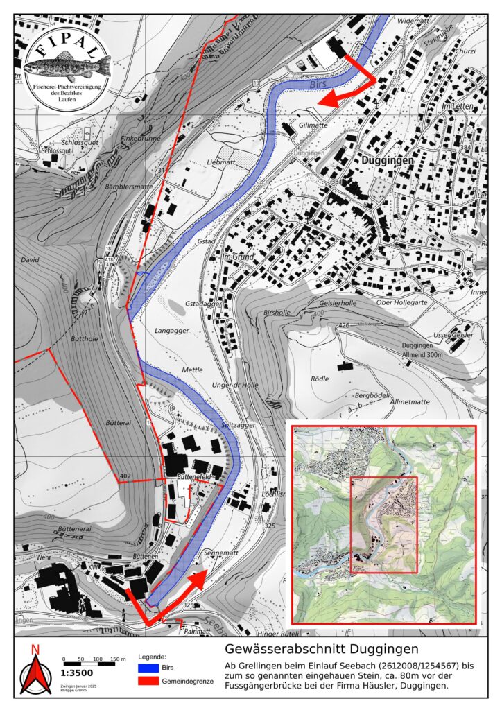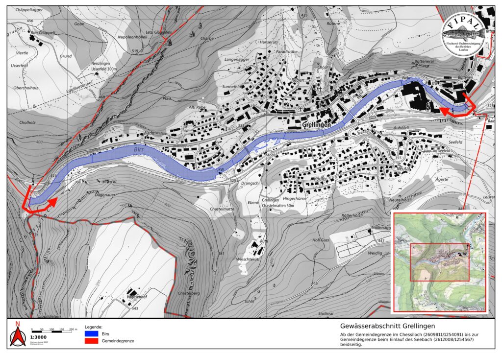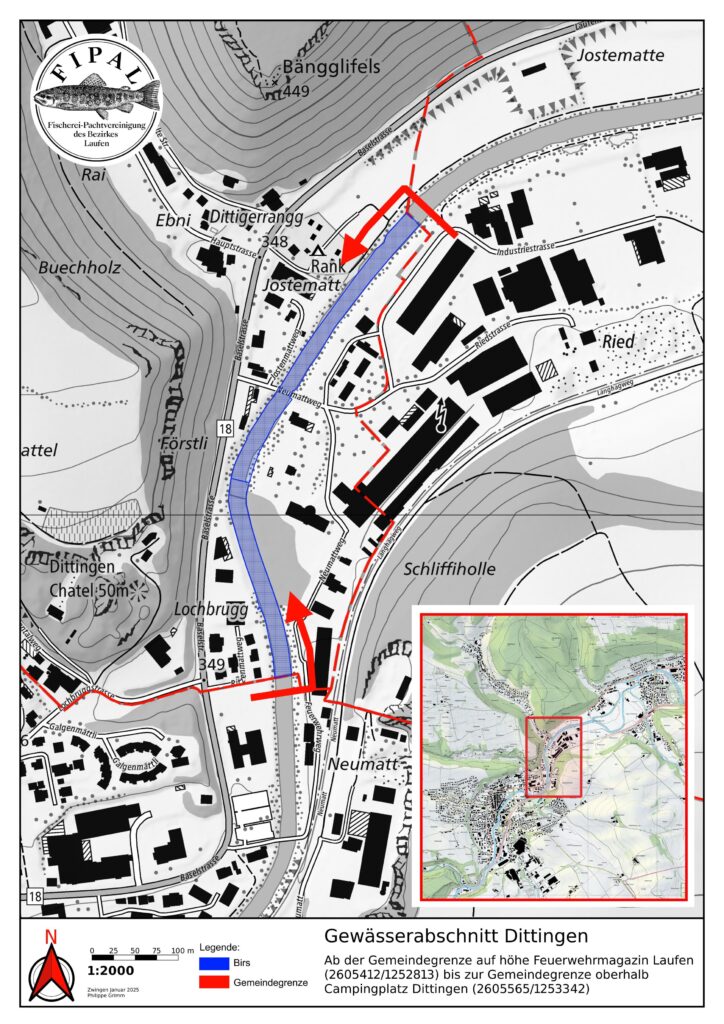 Hinter der Gärtnerei Wenger beim sog. Stäggehübel gehört das linke Ufer ein kurzes Stück der Gemeinde Pfeffingen. Dieses wird nicht von der Fipal gepachtet. Hier darf mit der Fipal-Karte nur auf der rechten Seite gefischt werden.