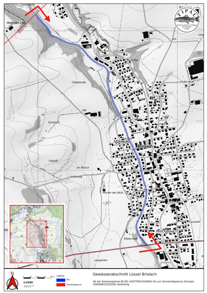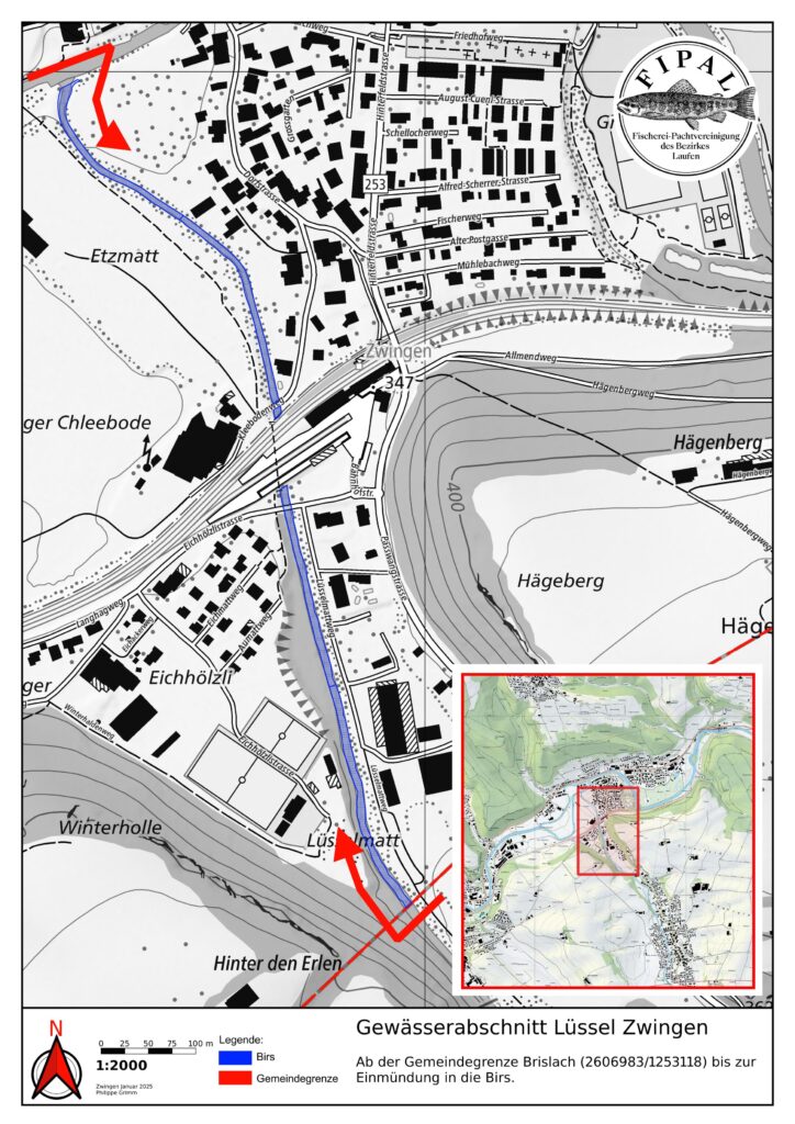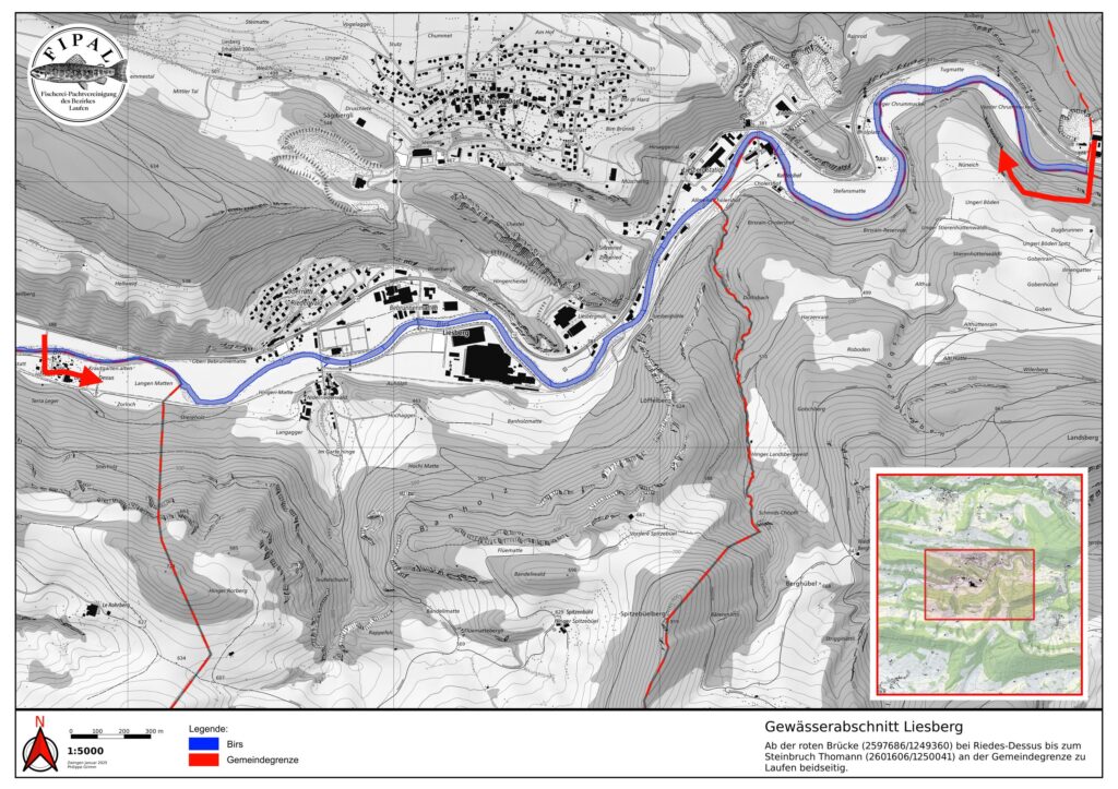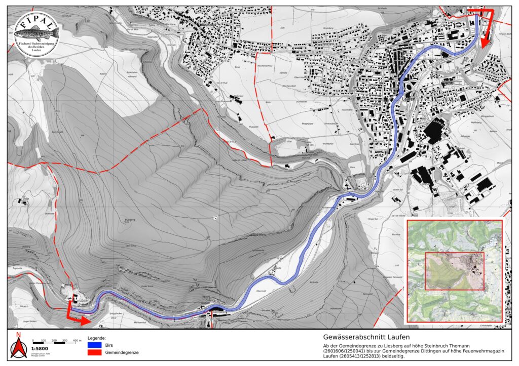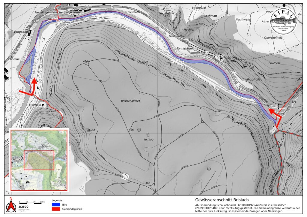 Hinter der Gärtnerei Wenger beim sog. Stäggehübel gehört das linke Ufer ein kurzes Stück der Gemeinde Pfeffingen. Dieses wird nicht von der Fipal gepachtet. Hier darf mit der Fipal-Karte nur auf der rechten Seite gefischt werden.
